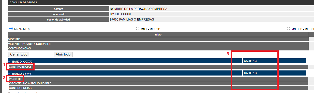 Finalmente al acceder a la información de la persona dispondremos de los montos de su deuda y contingencias, tanto en Moneda nacional como en Dólares Estadounidenses. De esta sección hace falta definir ciertos puntos antes de ver la imagen presentada: